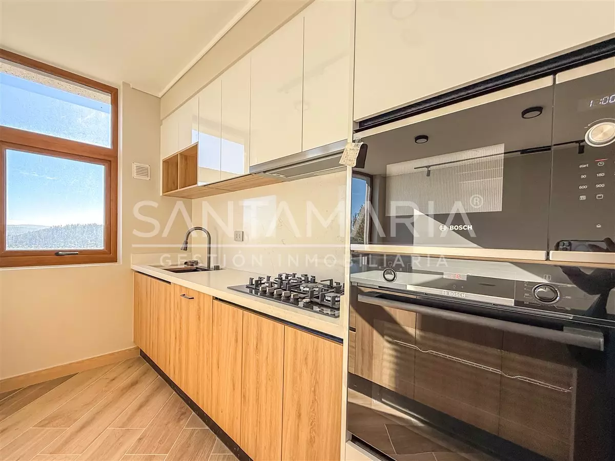 Cocina americana integrada, moderna y completamente equipada con artefactos Bosch: encimera, horno, campana, lavavajillas y refrigerador